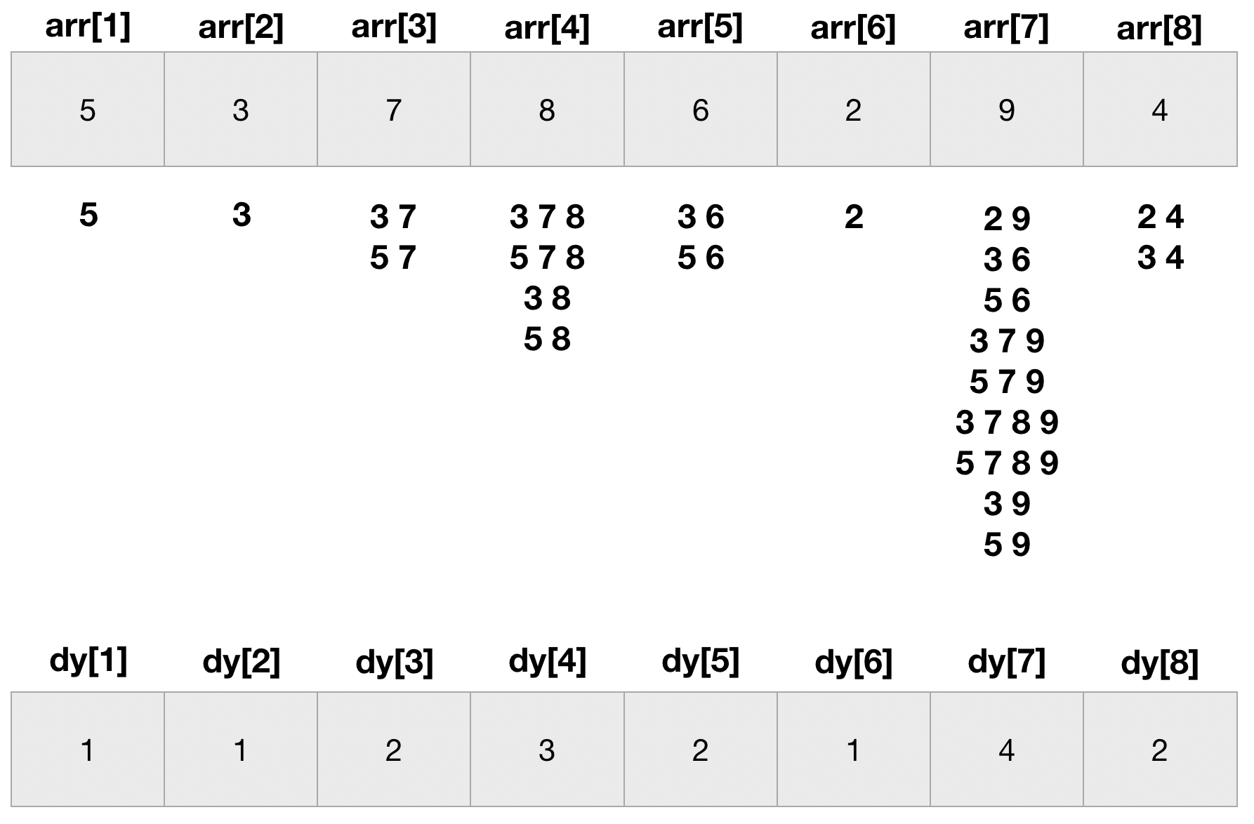 5. 자기 자신(arr[i])보다 작은 값(arr[j])이 있고 dy[j]가 기존의 max값 보다 크다면 dy[i] = max+1을 할당한다.