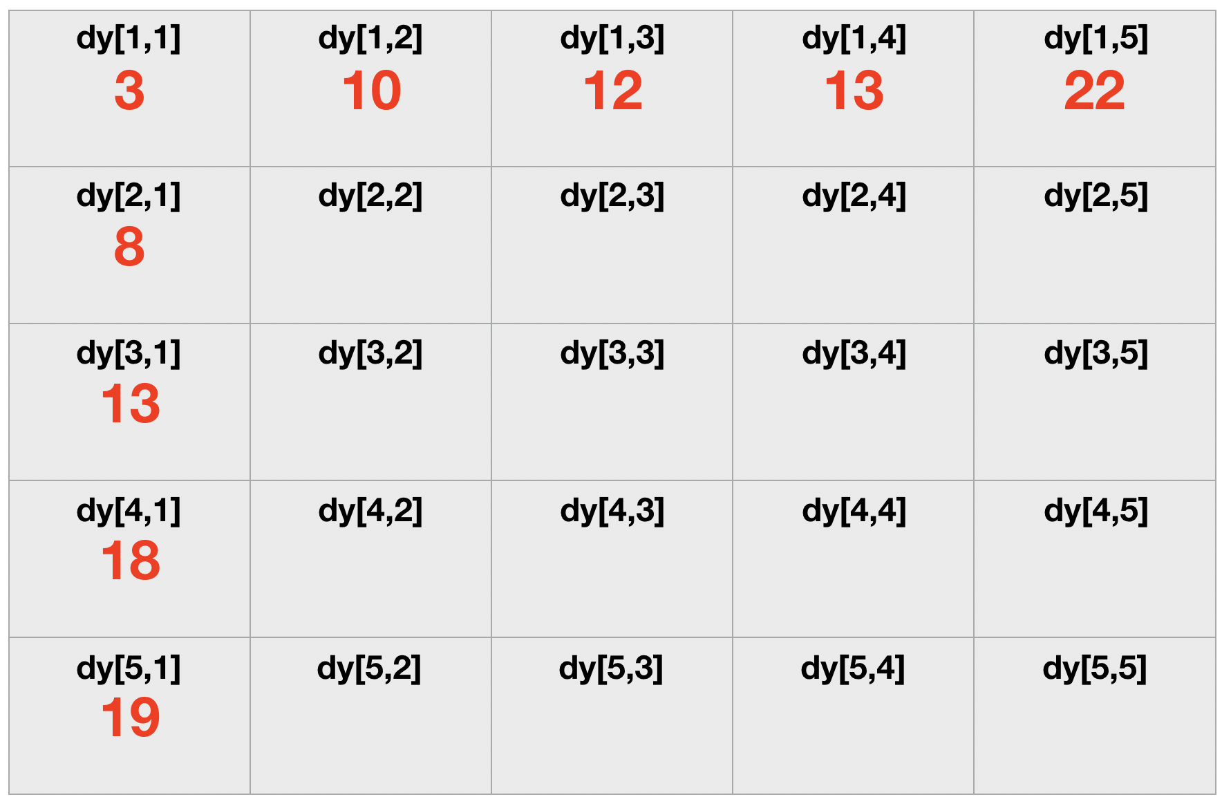 - dy[1,2]는 무조건 dy[1,1]에서만 올 수 있다. dy[1,5]는 무조건 dy[1,4]에서만 올 수 있다....