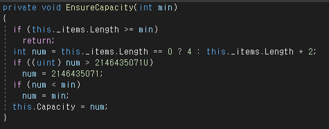 => EnsureCapacity를 보니, Length가 0이 아니면 무조건 Length의 2배를 Capacity Property에 할당해버림
