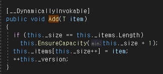 => Add 를 호출하면 현재 배열의 사이즈를 비교하고 if (this._size == this._items.Length) 가득찼다고 판단하면 EnsureCapacity 메서드를 호출한다.