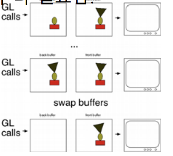 색깔 버퍼를 전면 후면버퍼 두가지로 사용한다. 다음 프레임에 출력할 이미지를 미리 계산하여 후면에 저장해놓음. 전면버퍼는 현재 처리해야할 레스터이미지를 렌더링함. 작업이 끝나면 Swap되어 전면이 후면이되고 후면이 전면이됨.