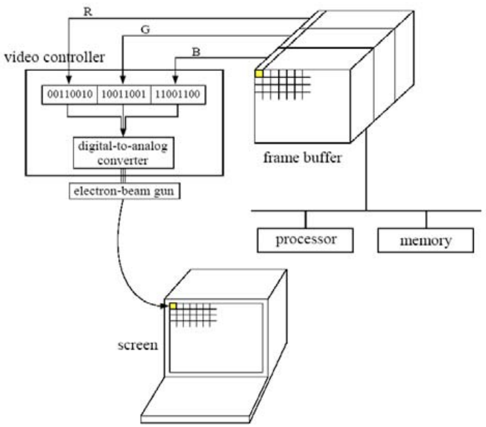 - 화면에 출력되는 레스터 이미지에 대한 픽스맵 데이터는 프레임 버퍼라고 불리는 메모리 한 부분에 저장되어야 한다.