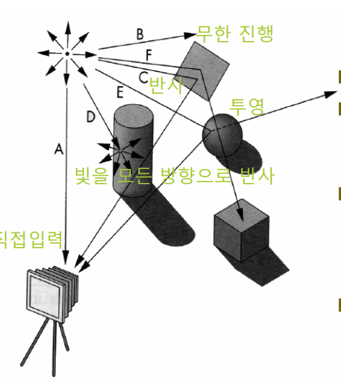 - 라디오시티(Radiosity) : 사물의 표면에서 발산되는 빛의 반사를 세밀하게 분석한 것을 기반으로하는 랜더링 기법이다. 즉, 점진적 음영을 표현할 수 있다.