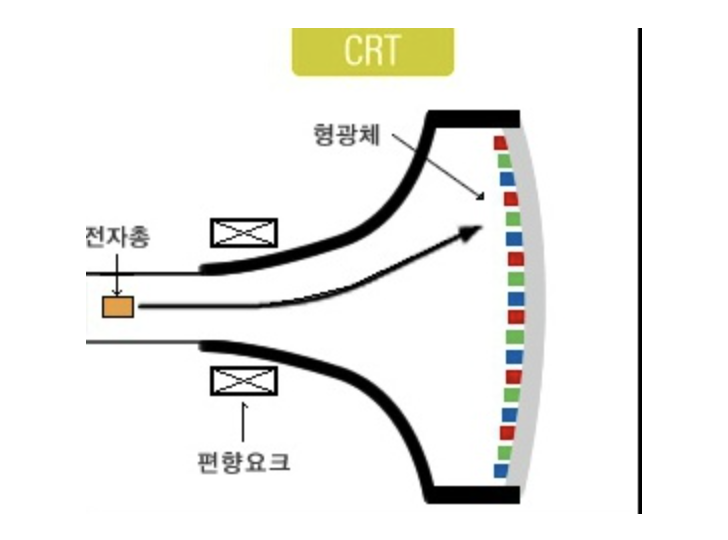 CRT는 음극선관 진공관이라고도 불리며 받는 신호를 전자총에서 음극선(전자빔)을 발사하여 유리에 칠해진 형광물질과 충돌하여 빛을 내는 방식이다.
