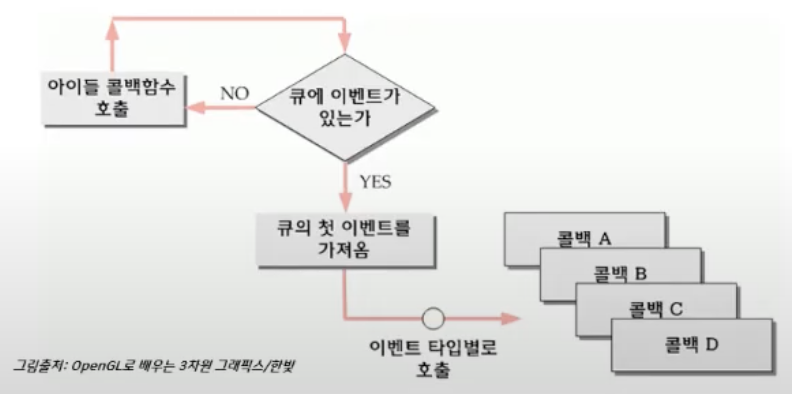 예를 들어, glutKeyboardFunc(keyboardEvent)로 명령어를 날리면 이벤트 큐에 마우스 입력함수에 따른 이벤트를 저장해놓고, 입력이 들어오면 큐에서 가장 먼저 들어온 이벤트를 가져오게 된다.