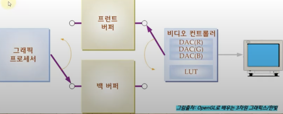 따라서, 프런트버퍼(현재) 백 버퍼(다음)으로 버퍼를 이중화 시켜놓고 현재 디스플레이에 뿌려줄 이미지를 연산한 데이터를 프런트 버퍼에 저장한다. 그 다음 비디오 컨트롤러에 의해 디스플레이에 뿌려준다. 이 동작 중에, 그래픽 프로세서는 다음 프레임에 대해 처리한 데이터를 미리 백 버퍼에 저장해 놓은 것이다. 프런트 버퍼의 작업이 완료되면 프런트 버퍼와 백 버퍼가 스왑버퍼에 의해 스왑되면서 다음 프레임을 곧 바로 비디오 컨트롤러에 의해 디스플레이에 뿌려줄 수 있는 것이다.