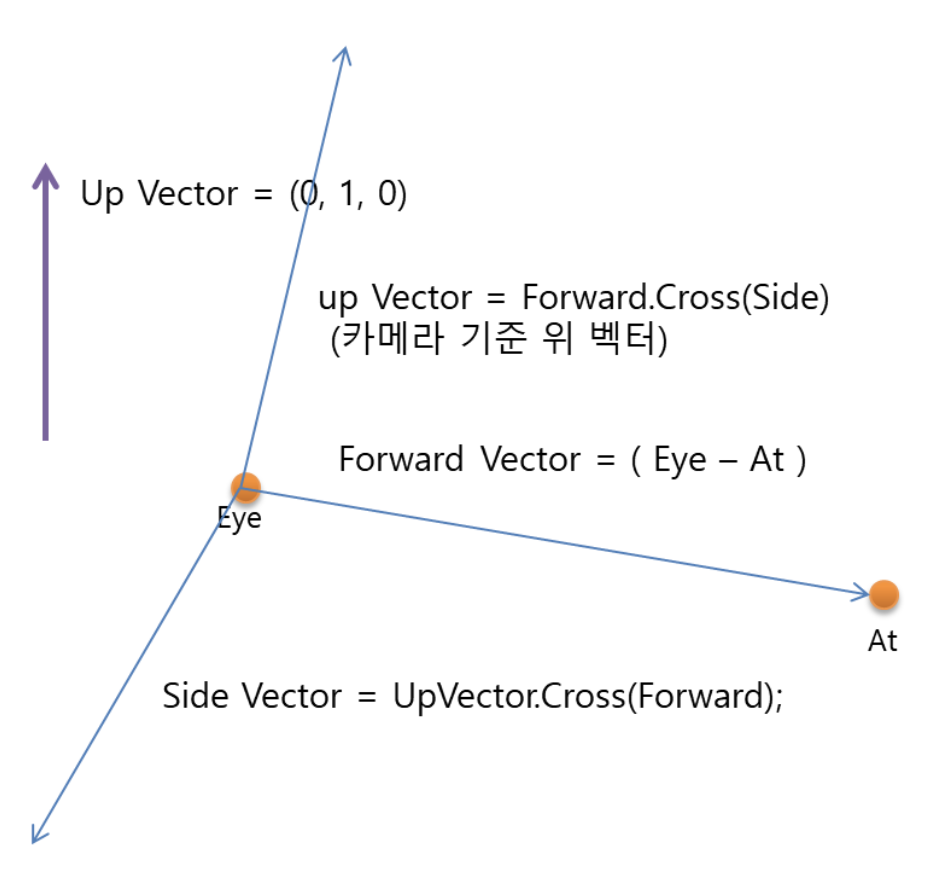 sideVector는 UpVector와 ForwardVector의 외적이다. 두 벡터의 곱은, 두 벡터가 이루는 평면에 수직인 벡터를 만든다.