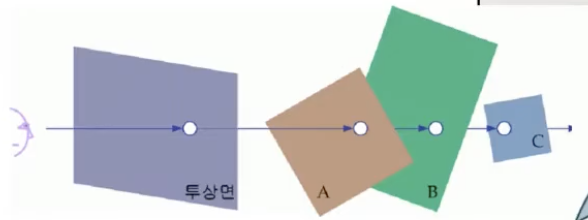 - z축에 따라 물체 단위로 정렬한 후 뒤쪽 물체부터 차례대로 그려나감