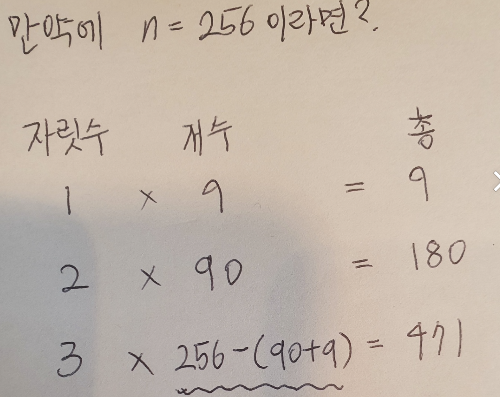 반복을 멈춰야 하는 시점은, 256은 3자리 수이기 때문에 3자리 수의 총 개수인 999개를 넘어서면 안된다.