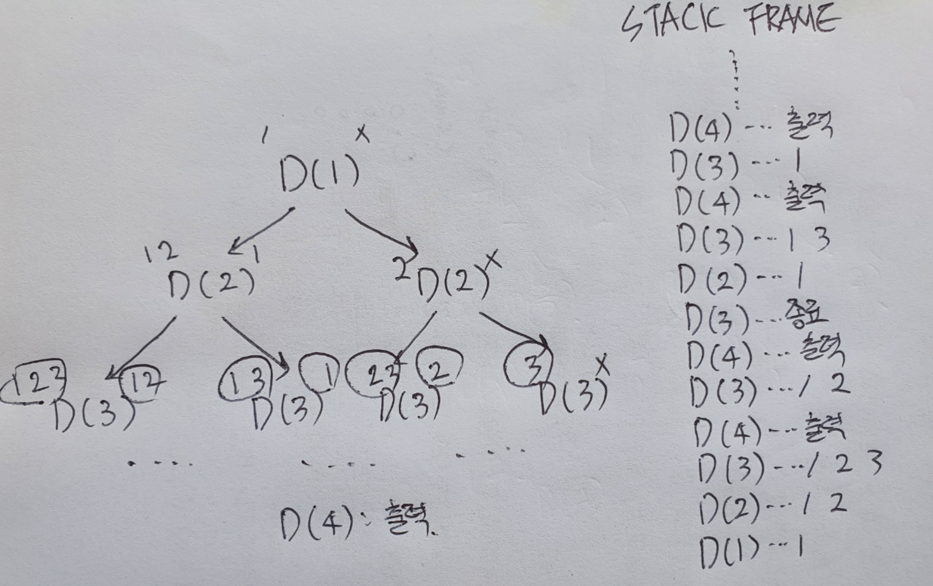 참고로, 위의 D(3)...1 2 3과 D(3)...1 2는 트리에서 맨 왼쪽 하단의 함수로써, 서로 같은 함수이다. 따라서 STACK FRAME에 저렇게 표기하는건 올바르지 않다. D(3)...1 2 3을 마치고 D(4)...출력을 한다음 D(4)가 STACK FRAME에서 삭제되어, D(3)... 1 2를 실행한다고 생각해야 한다. 내가 표기한 STACK FRAME은 단지 함수 실행 순서가 저렇다라고만 이해해야 한다.