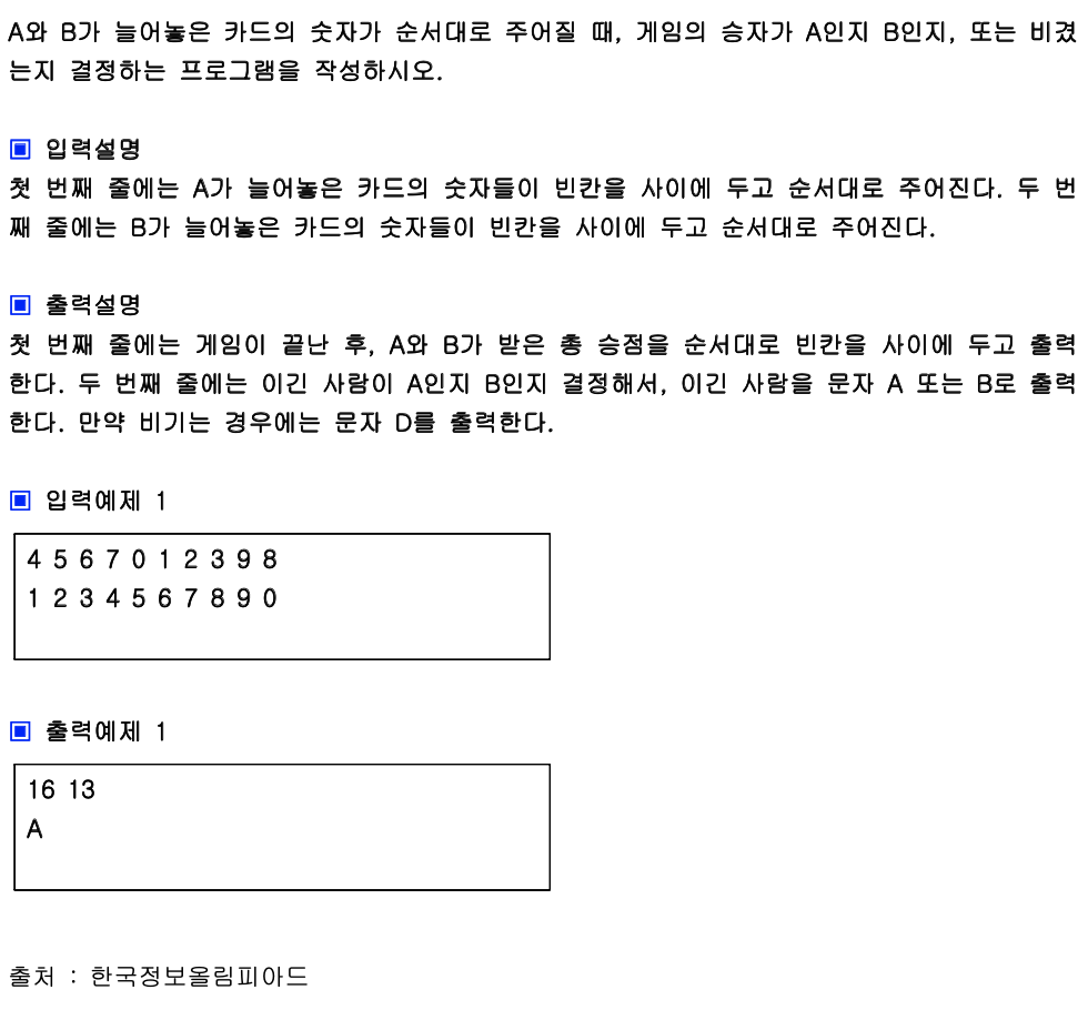 - 문제에서, 총점이 같은 경우에는 마지막에 이긴 사람을 승자로 한다고 했는데 본인은 "마지막 라운드"라고 잘못 읽어서 무조건 A[9]와 B[9]를 체크해야겠다고만 생각했다... 그래서 완전 꼬였다. 문제를 제대로 읽어야겠다..ㅠㅠ